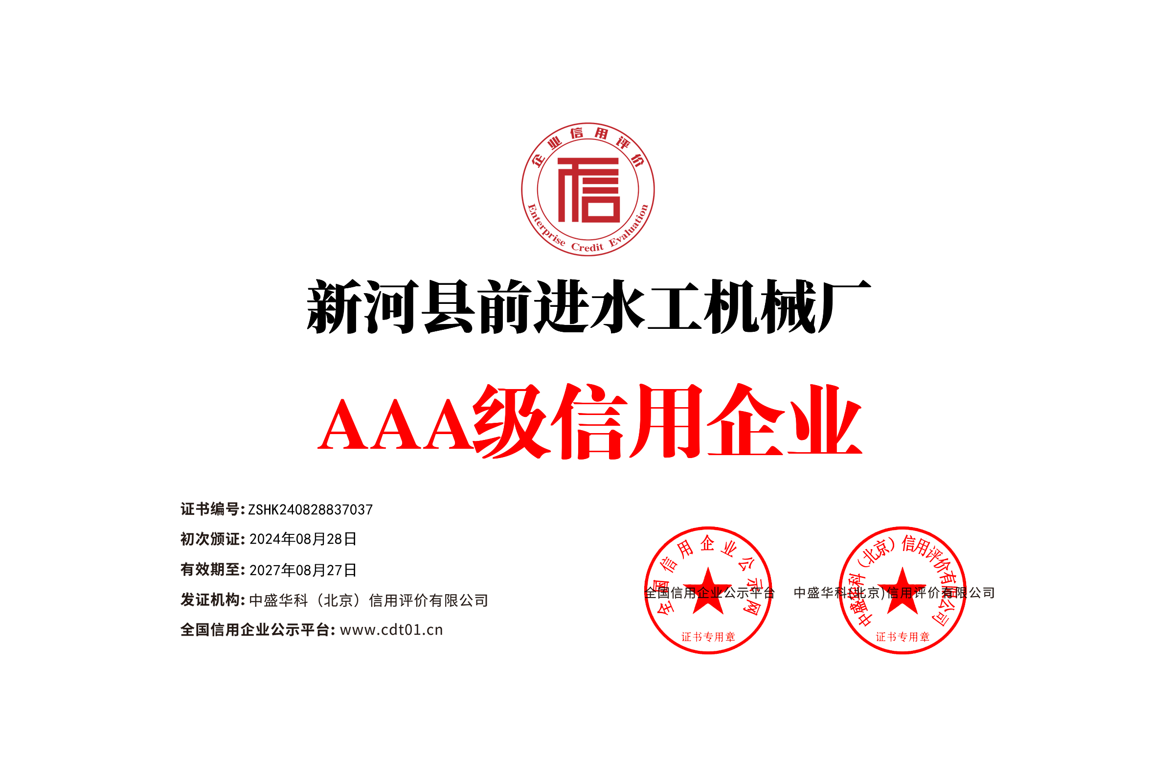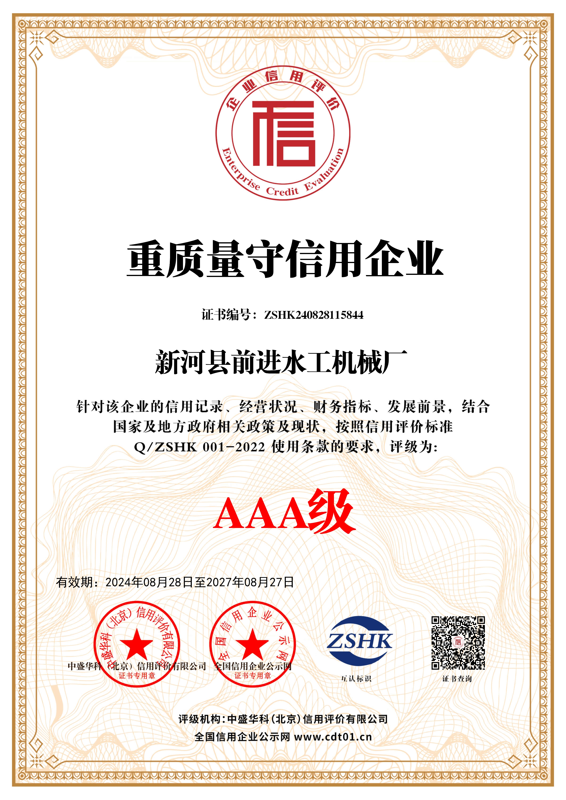 誠信企業信用等級證書